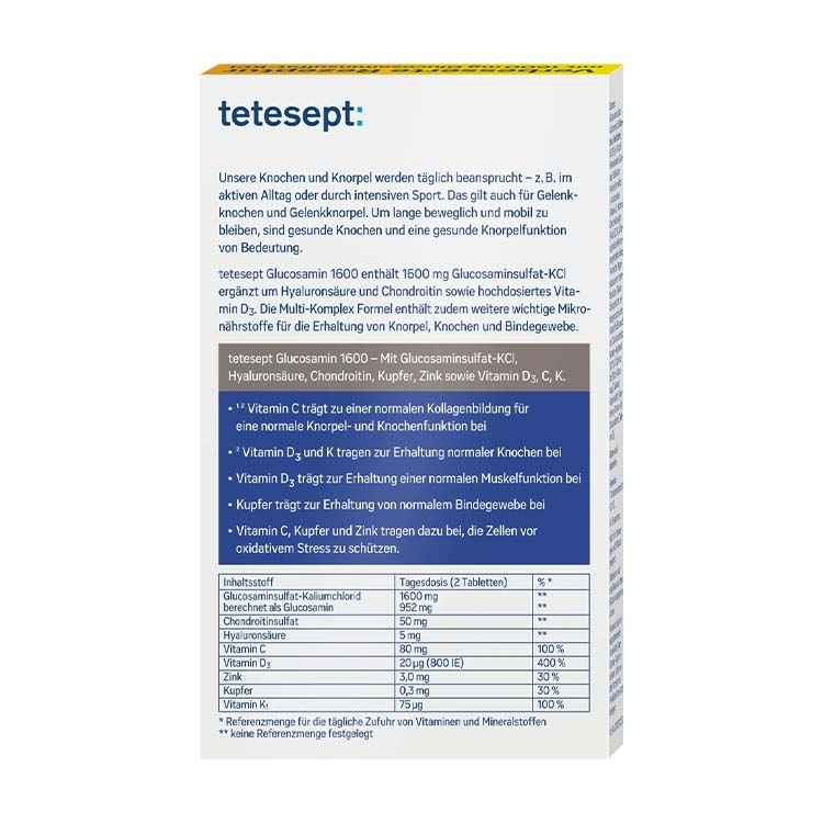 قرص گلوکوزامین 1600 و هیالورون Tetesept محصولی از برند معتبر تتسپت بوده که دارای ترکیباتی کامل و جامع از ویتامین ها، مواد معدنی و گلوکوزامین است و در پیشگیری و درمان بیماری های مفصلی مانند آرتروز، استئوآرتریت و همچنین درمان درد و خشکی مفاصل تاثیر بسزایی دارد. قرص گلوکوزامین تتسپت با داشتن ویتامین های C + D + K باعث حفظ سلامت و افزایش تراکم استخوان ها شده و به کلاژن سازی می پردازد. همچنین با داشتن گلوکوزامین، هیالورونیک اسید و کندرویتین به افزایش مایع میان مفصلی کمک می کند و از ساییدگی مفاصل و تمامی مشکلات مربوط به مفاصل و غضروف ها جلوگیری خواهد کرد. وجود زینک و مس در این محصول از خشکی مفاصل جلوگیری کرده و یک مکمل آنتی اکسیدان قوی نیز به شمار می رود. کاهش درد، بهبود عملکرد کلی و انعطاف پذیری مفاصل، غضروف سازی و پیشگیری و درمان بیماری های مفصلی مانند آرتروز و استئوآرتریت از ویژگی های مهم قرص گلوکوزامین تتسپت به شمار می رود. مکمل گلوکوزامین و هیالورون Tetesept فاقد گلوتن و لاکتوز است و برای تمامی سنین و ورزشکاران آقا و خانم قابل استفاده می باشد.